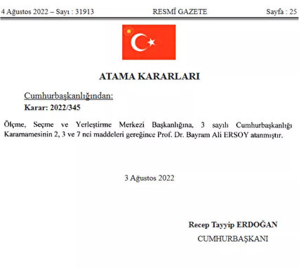 Ölçme, Seçme ve Yerleştirme Merkezi (ÖSYM) Başkanlığına Prof. Dr. Bayram Ali Ersoy atandı.