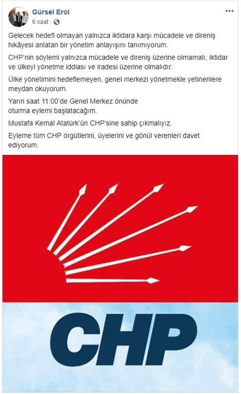 CHP’nin 41 yıl sonra Elazığ’dan çıkardığı ilk milletvekili olan Gürsel Erol, partisinin Türkiye genelindeki başarısızlığının faturasını Genel Başkan Kemal Kılıçdaroğlu’na çıkartarak, “Gelecek hedefi olmayan yalnızca iktidara karşı mücadele ve direniş hikâyesi anlatan bir yönetim anlayışını tanımıyorum. CHP’nin söylemi yalnızca mücadele ve direniş üzerine olmamalı; iktidar ve ülkeyi yönetme iddiası ve iradesi üzerine olmalıdır. Ülke yönetimini hedeflemeyen, genel merkezi yönetmekle yetinenlere meydan okuyorum. Yarın saat 11.00’de Genel Merkez önünde oturma eylemi başlatacağım. Mustafa Kemal Atatürk’ün CHP’sine sahip çıkmalıyız. Eyleme tüm CHP örgütlerini, üyelerini ve gönül verenleri davet ediyorum “ diye açıklamada bulunmuştu.