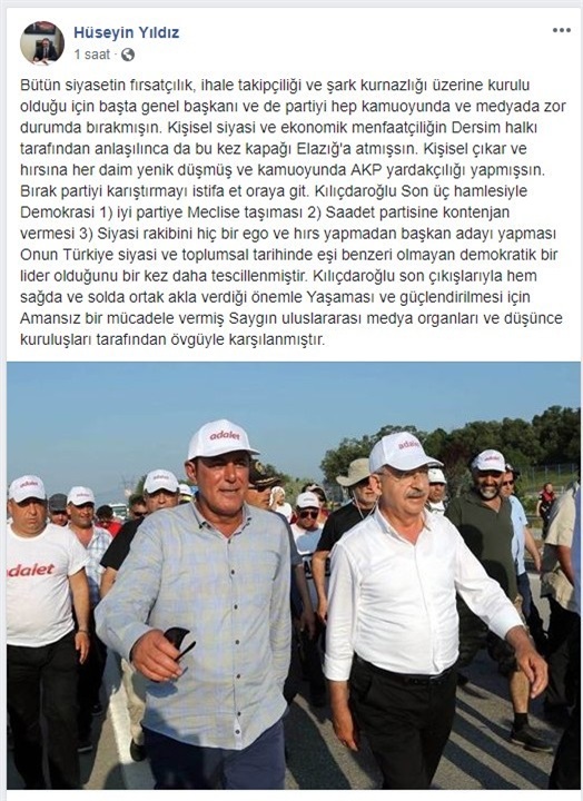 Parti yönetimini ağır sözlerle eleştiren ve partilileri de Çarşamba günü 11.00’den itibaren Genel Merkez önünde oturma eylemine çağıran Elazığ milletvekili Gürsel Erol’a, CHP Aydın milletvekili Hüseyin Yıldız sosyal medyadan ağır sözlerle yüklendi. Sosyal medya hesabında Gürsel Erol’u eleştiren paylaşımda bulunan Yıldız, “Bütün siyasetin fırsatçılık, ihale takipçiliği ve şark kurnazlığı üzerine kurulu olduğu için başta Genel Başkanı ve de partiyi hep kamuoyunda ve medyada zor durumda bırakmışın. Kişisel siyasi ve ekonomik menfaatçiliğin Dersim halkı tarafından anlaşılınca da bu kez kapağı Elazığ’a atmışsın. Kişisel çıkar ve hırsına her daim yenik düşmüş ve kamuoyunda AKP yardakçılığı yapmışsın. Bırak partiyi karıştırmayı istifa et oraya git “ şeklinde ağır ifadeler kullandı.