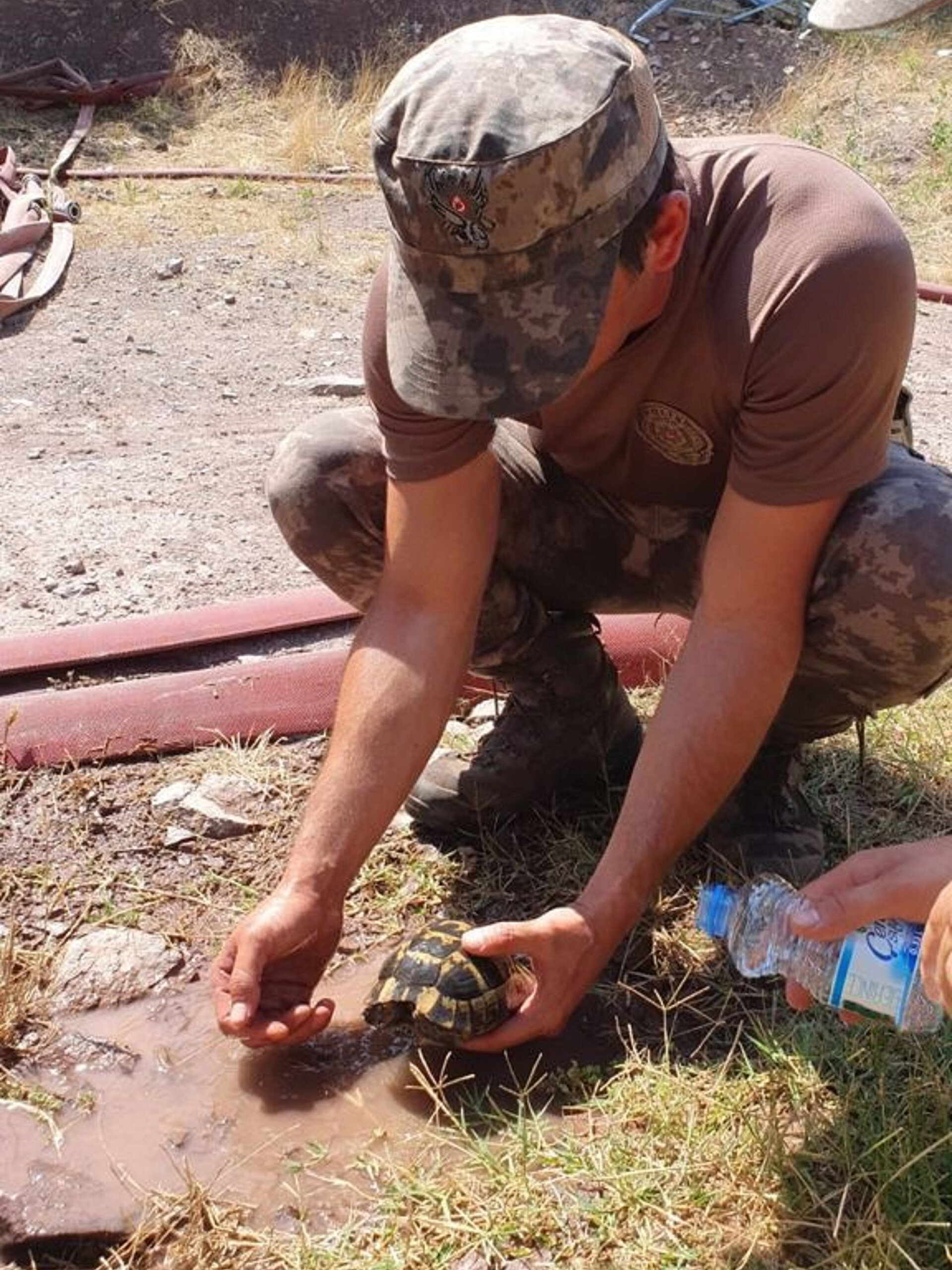 Alevleri söndüren ekipler, yanan arazide buldukları bir kaplumbağayı da kurtardı. Bir özel harekat polisi, kurtardıkları kaplumbağaya elleri ile su içirdi.