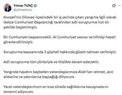 Tunç, NSosyal hesabından yaptığı açıklamada, Gebze Cumhuriyet Başsavcılığınca yangınla ilgili başlatılan soruşturmada, bir Cumhuriyet başsavcıvekili ve iki Cumhuriyet savcısı ile bilirkişi heyetinin görevlendirildiğini belirtti.