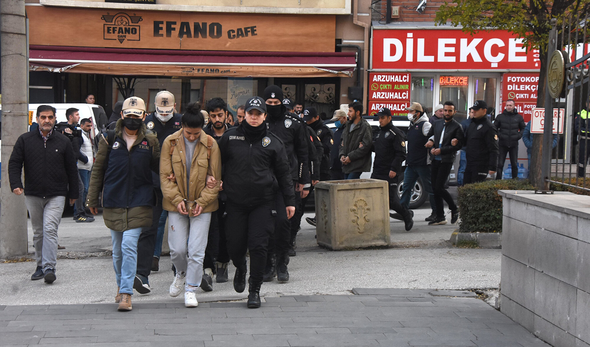 Eskişehir'de Pençe-Kılıç Hava Harekatı'nı protesto etmek için bir grup tarafından izinsiz gösteri düzenlemişti. Savcılık talimatıyla polisin evlerine yaptığı baskında gözaltına alınan 1'i kadın 8 şüpheli, adliyeye sevk edildi.