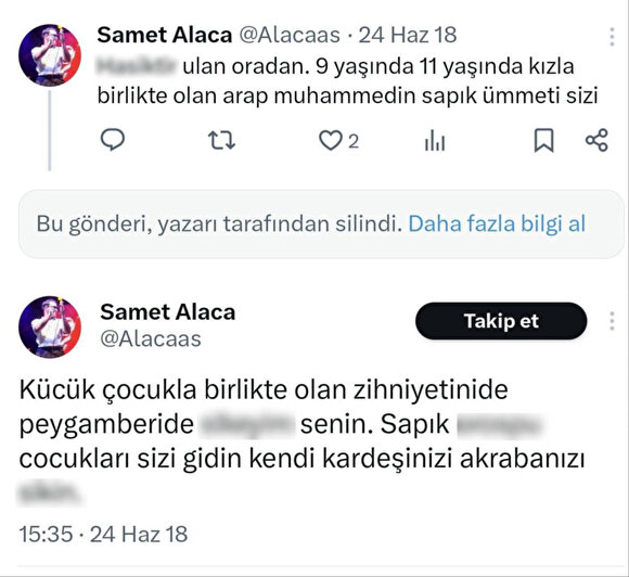 "Şu ... çocuğu Tayyip Erdoğan'a suikast düzenleyin de kurtulalım arkadaş", "Ha ... ulan oradan. 9 yaşında 11 yaşında kızla birlikte olan arap muhammedin sapık ümmeti sizi", "Küçük çocukla birlikte olan zihniyetinide peygamberide ... senin. Sapık ... sizi gidin kendi kardeşinizi akrabanızı ..."