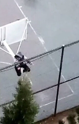 - Korkan çocuk köpekten kaçmaya çalıştı. Köşeye sıkışan çocuk, en son çareyi basket potasına çıkmakta buldu. O anlar cep telefonu kamerası ile kaydedildi.