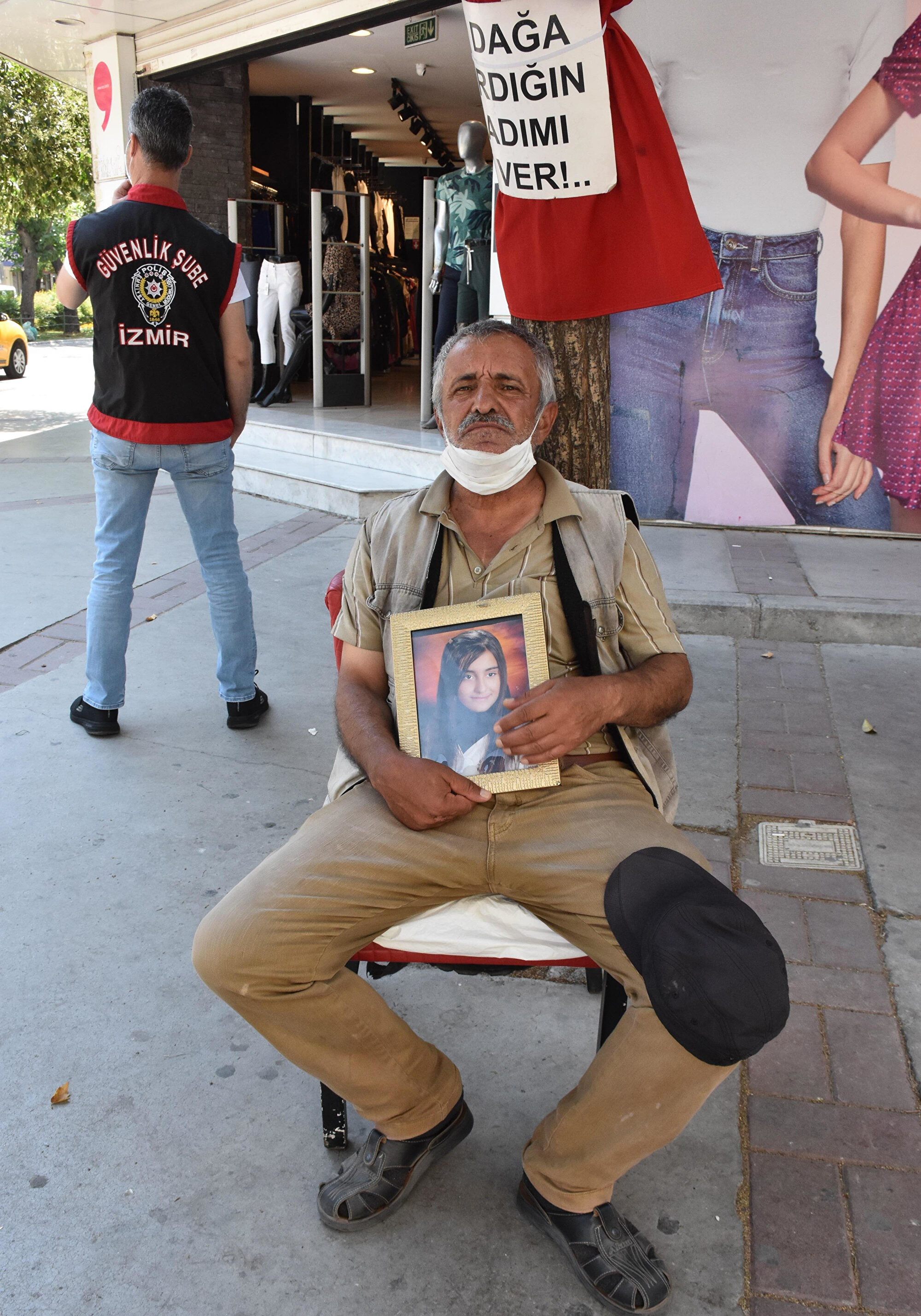 Diyarbakır'da çocukları kaçırılan ailelerin başlattığı oturma eylemine katılan ancak bypass ameliyatı olmak için yaşadığı İzmir'e dönen Mehmet Laçin, burada HDP İzmir il binası önünde aralıklarla sürdürdüğü eylemine devam ediyor. Polis güvenliği eşliğinde üzerine astığı Türk bayrağıyla nöbet tutan Laçin, kucağında kızı Gamze'nin çerçevelettirdiği fotoğrafını taşıyor.