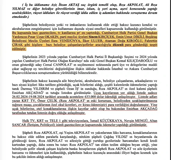 - "Şüphelinin belediyenin yetki ve imkanlarını kullanarak elde ettiği haksız kazancı kendisi ve akrabalarının zenginleşmesi için kullanması dışında siyasi emelleri kapsamında kullandığı görülmüştür. Bu kapsamda bazı gazetecilere, tv kanllarına pr' ını yaptırdığı,Cumhuriyet Halk Partisi Genel Başkan Yardımcısı Pınar Uzun OKAKIN, parti meclisi üyeleri Sinem KIRÇİÇEK, Emin Umut DİKİLİ, Beşiktaş Belediyesi Meclis Üyeleri Esra YENİDÜNYA, İlker ULUER, Ataman Doğa KIROĞLU, Fahrettin ÇIRAK gibi kişilere bazı belediye çalışanları/şoförler aracılığıyla düzenli para gönderdiği tespit edilmiştir. Şüphelinin 2023 yılında yapılan Cumhuriyet Halk Partisi İl Başkanlığı Seçimi ve 2024 yılında yapılan Cumhuriyet Halk Partisi Olağan Kurultayı' nda eski Genel Başkan Kemal KILIÇDAROĞLU ve onun gösterdiği aday Cemal CANPOLAT' in seçilmemesi noktasında parti üye ve delegelerine maddi çıkar sağlayıp oy tercihlerini değiştirdiğine ilişkin iddialar hakkında İstanbul ve Ankara Cumhuriyet Başsavcılıklarınca soruşturmaların yürütüldüğü bilinmektedir.