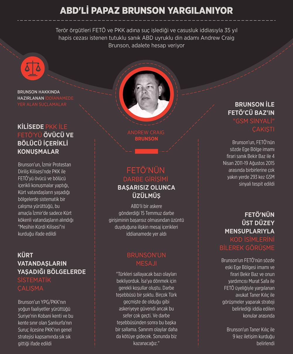 İzmir'in Aliağa ilçesindeki Şakran Cezaevi İnfaz Kurumu kampüsünde terör örgütleri FETÖ ve PKK adına suç işlediği ve casusluk iddiasıyla yargılanmasına devam edilen ABD'li papaz Andrew Craig Brunson yargılanmasına devam ediliyor.