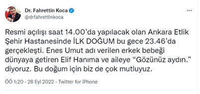 , "Resmi açılışı saat 14.00'te yapılacak olan Ankara Etlik Şehir Hastanesinde ilk doğum bu gece 23.46'da gerçekleşti. 'Enes Umut' adı verilen erkek bebeği dünyaya getiren Elif Hanım'a ve aileye gözünüz aydın diyoruz. Bu doğum için biz de çok mutluyuz." ifadesini kullandı.