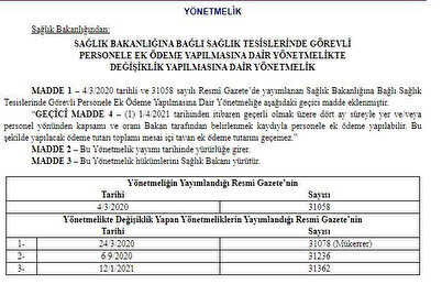 MADDE 1 – 4/3/2020 tarihli ve 31058 sayılı Resmî Gazete’de yayımlanan Sağlık Bakanlığına Bağlı Sağlık Tesislerinde Görevli Personele Ek Ödeme Yapılmasına Dair Yönetmeliğe aşağıdaki geçici madde eklenmiştir.
