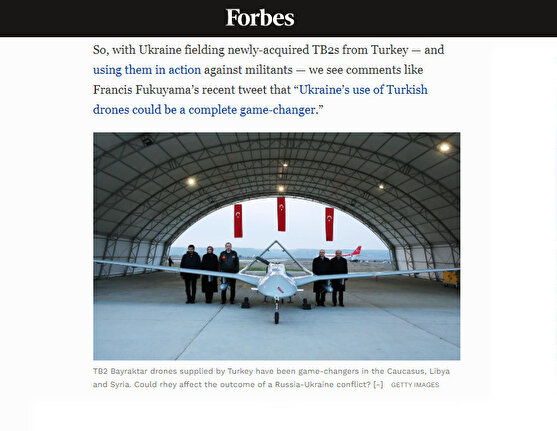 Amerikan Forbes dergisi, Ukrayna-Rusya kriziyle ilgili analizinde, Ukrayna ordusunun envanterinde bulunan Bayraktar TB2 SİHA'lara geniş yer ayırdı. Türk SİHA’ları için "Rusya’yla Ukrayna arasındaki olası bir çatışmada dengeyi bozabilir. Rusya daha önce onları durdurmakta çaresiz kaldı. Rus ordusu, Türk İHA’larını Ukrayna için kuvvet çarpanı olarak kabul ediyor" ifadeleri kullanıldı.