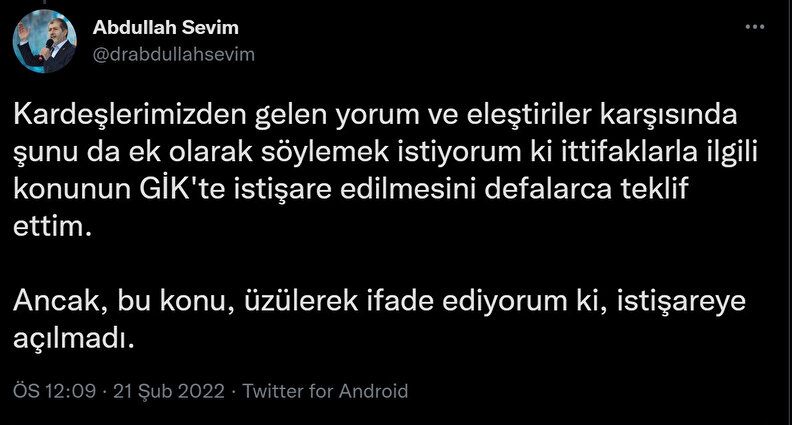 Saadet Partisi Genel İdare Kurulu Üyesi Dr. Abdullah Sevim, parti tabanının CHP ile kurulan ittifaktan rahatsız olduğunu belirterek, "Bizim tabanımız CHP ve HDP ile bir algılanmamızdan, görünmemizden hoşnut değil" dedi. Sevim, "Eğer illa ki bir ittifakın içerisinde olacaksak bunun 3. ittifak olması gerek" diyerek parti yöneticilerine çağrıda bulundu.