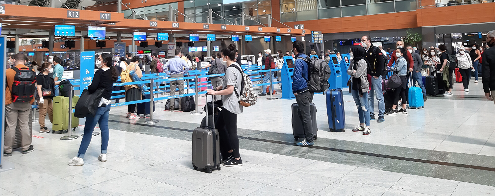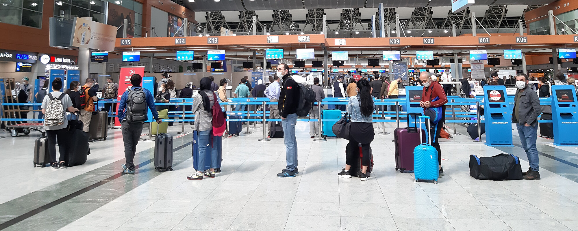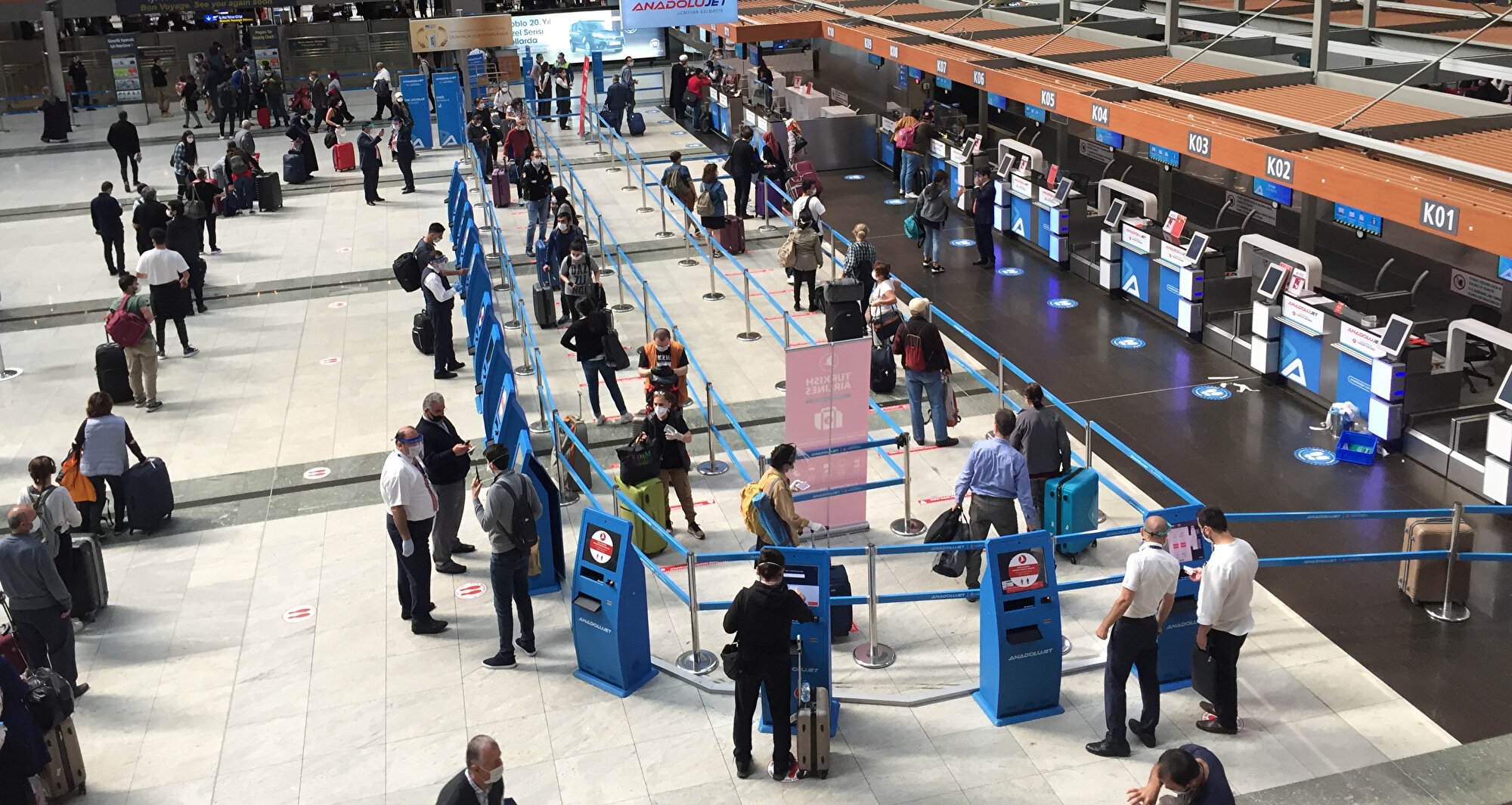 İstanbul Sabiha Gökçen Uluslararası Havalimanı'nda, Pegasus Hava Yolları ve AnadoluJet'in iç hat sefer sayılarını arttırmasıyla haftalar sonra en kalabalık gün yaşanıyor. Yolcular, sosyal mesafe kurallarına göre ve termal kameralarla ateş ölçümleri yapılarak binaya alınıyor. Terminal binasına maskesiz yolcu alınmazken güvenlik kontrolünden geçen yolcular görevliler tarafından bilet işlemleri ve bagaj teslimi için yönlendiriliyor.