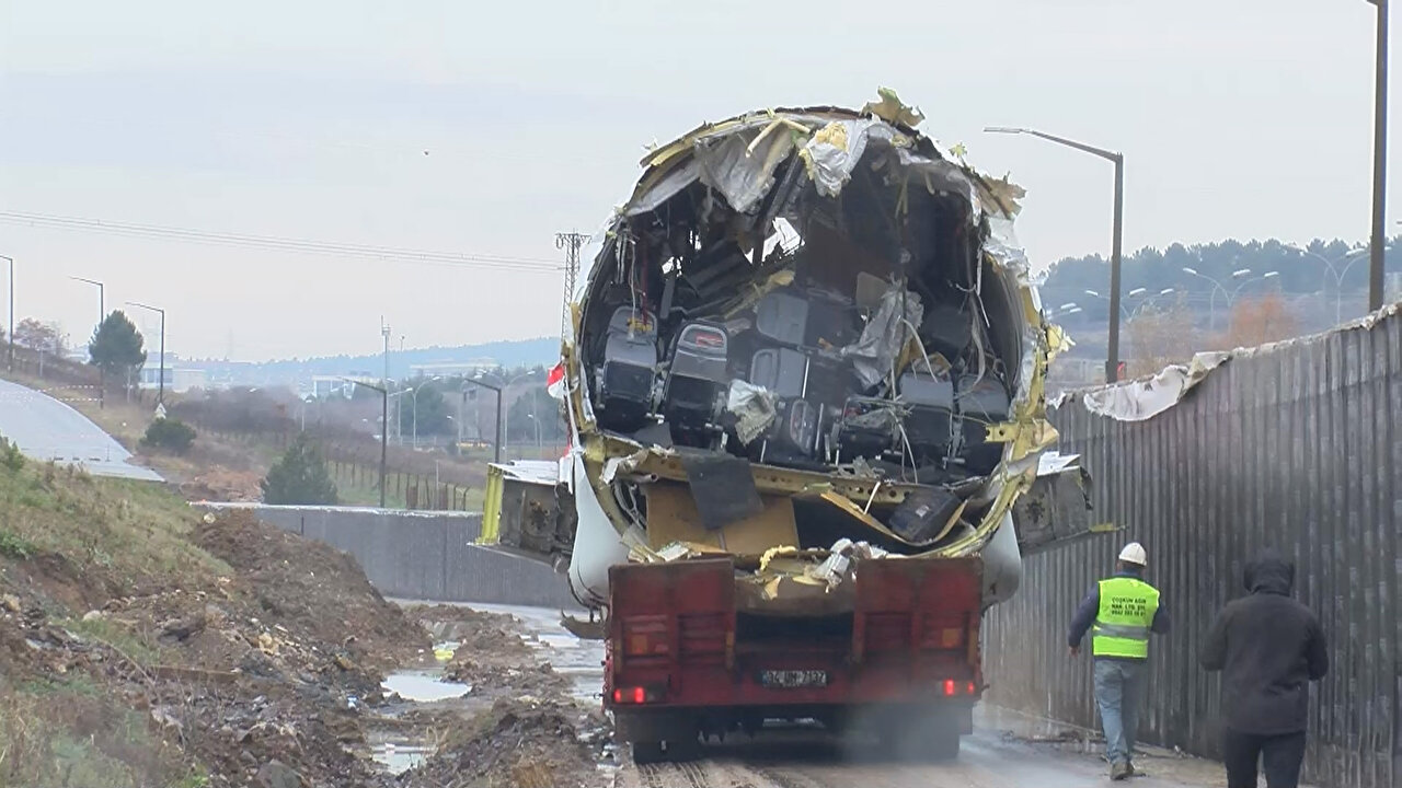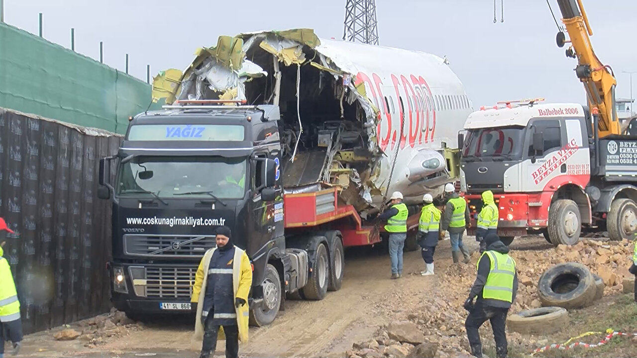 Sabiha Gökçen Havalimanı'nda pistten çıkan uçağın gövde bölümü kaldırıldı. Ekipler uçağın en büyük parçası olan gövde bölümünü vinç yardımıyla ağır tonajlı araca yükledi.
