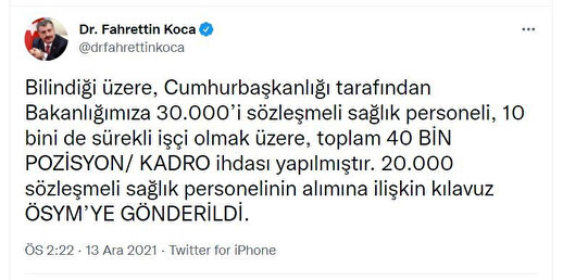 - Bakan Koca, Twitter hesabından yaptığı açıklamada, Cumhurbaşkanlığı tarafından Sağlık Bakanlığı'na 30 bini sözleşmeli sağlık personeli, 10 bini de sürekli işçi olmak üzere, toplam 40 bin kadro ihdası yapıldığını hatırlatarak, "20 bin sözleşmeli sağlık personelinin alımına ilişkin kılavuz ÖSYM'ye gönderildi. Taşra teşkilatımızda istihdam edilmek üzere, KPSS puanına göre, ÖSYM tarafından yapılacak merkezi yerleştirme ile 20 bin sözleşmeli personel alım sürecini başlatıyoruz. Gerekli bilgiler, tercih kılavuzu hazırlanmak üzere ÖSYM’ye verilmiştir. 10 bin 348 hemşire, 1600 ebe ve 6 bin 604 sağlık teknisyeni/ sağlık teknikeri ile psikolog, sosyal çalışmacı, biyolog, odyolog, çocuk gelişimcisi, diyetisyen, fizyoterapist, iş ve uğraşı terapisti, dil ve konuşma terapisti, perfüzyonist ve sağlık fizikçileri alımı yapılacaktır" ifadelerini kullandı.