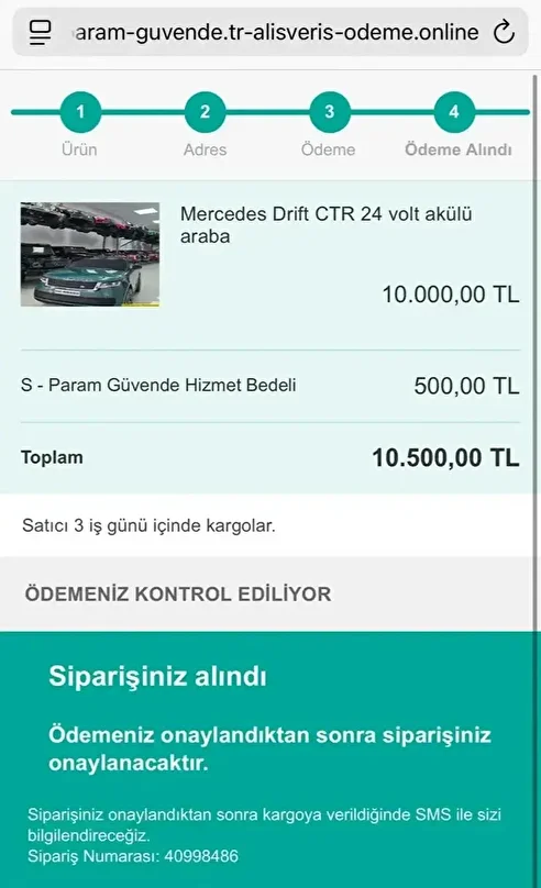Ancak ödeme aşamasında yönlendirildiği bağlantı, (https://sahibinden-param-guvende.tr-alisveris-odeme.online) aslında dolandırıcılar tarafından hazırlanmış sahte bir siteydi.
