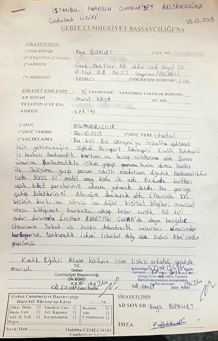 - “Ukrayna’daki bir inşaat firmasına 110 kişinin evraklarını verdik. Daha sonra bizden bir bankada hesap açmamızı istediler. Bu bankanın yetkilileriyle görüşme yaptık. Firmanın bizden banka kartının şifrelerini istediğini söyledik. Bu şifreleri verirsek başımıza sıkıntı gelir mi diye sorduk. Bu kartlarla kimse işlem yapamaz dediler. Biz de bundan sonra şifrelerimizi şirkete verdik. Bizleri ek hesaptan ikişer bin TL borçlandırmışlar.