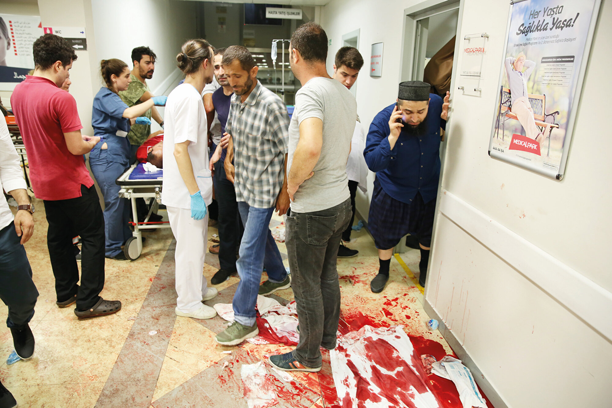Aynı saatlerde hastanelerde tam bir can pazarı yaşanıyordu. Belediyenin hemen karşısında bulunan Medical Park Hastanesi de o adreslerden birisiydi. Kan gölüne dönen acil serviste sandalyeler dahil her yer şehit ve yaralılarla dolup taştı.
