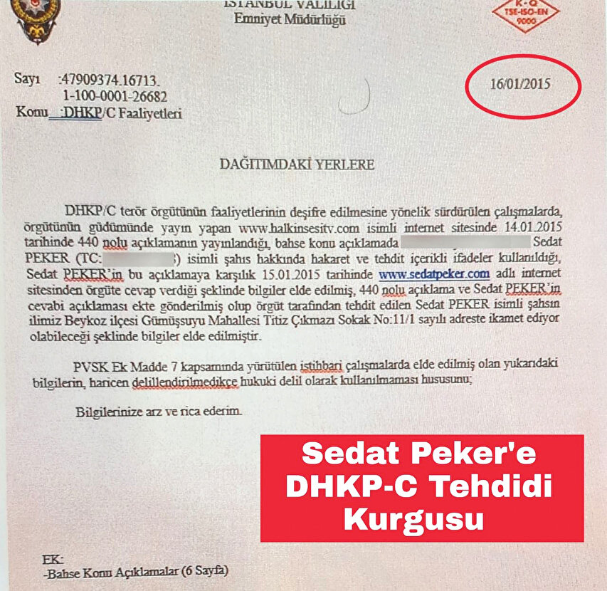 Bu talebin ardından İstanbul İstihbarat Şube Müdürlüğü’nden 20 Şubat’ta, Terörle Mücadele Şube Müdürlüğünden de 26 Şubat’ta İstanbul Koruma Şube Müdürlüğü’ne “Sorumlu İl Emniyet Müdür Yardımcıları” imzasıyla Peker’in DHKP-C tarafından tehdit edildiğine yönelik yazılar yazıldı.