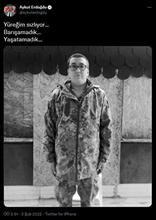 Şırnak'ın Cizre ilçesinde PKK tarafından düzenlenen havan saldırısında şehit olan Piyade Er Tarık Tarcan için Twitter'dan bir paylaşım yapan CHP Milletvekili Aykut Erdoğdu'nun sözleri infiale neden oldu. Tarcan'ı katleden PKK'yı işaret ederek 'Barışamadık' diyen Erdoğdu, sözlerini 'Kürt sorunu' için sarf ettiğini belirtti.