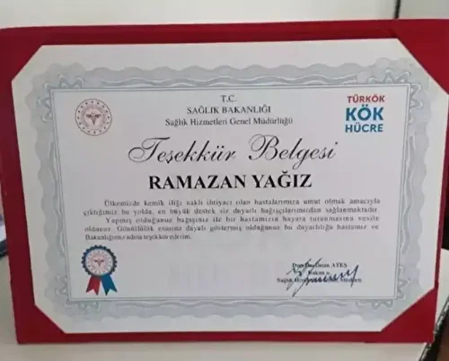 Şehit Yağız, Sağlık Bakanlığı tarafından gönderilen Teşekkür Belgesi’ni ve mutluluğunu, "Bundan yaklaşık 10 sene önce kök hücre (kemik iliği) bağışçısı olmak ister misiniz sorusuna evet dedim ve 10 yıl sonra geçtiğimiz Mart ayında kanser olan bir hasta ile uyumlu olduğum haberini aldım. Çeşitli testler sonrası Haziran ayında Ankara Bilkent Şehir Hastanesi'nde nakil gerçekleşti ve 3 ayı aşkın bir sürenin sonunda bugün hastanın taburcu olduğu bilgisini aldım.