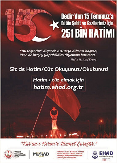 MÜSİAD, “Bedir’den 15 Temmuz’a, Bütün Şehitler ve Gazilerimiz İçin 251 Bin Hatim” kampanyası başlattı. 15 Temmuz FETÖ darbe girişiminin 4. yıl dönümünde, okunan hatimlerin duası yapılacak.