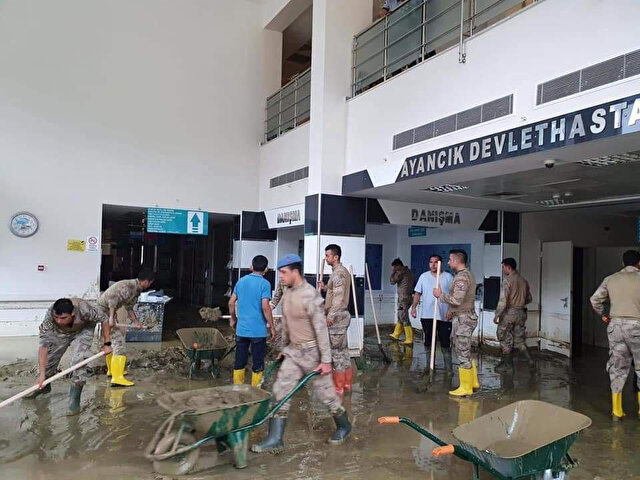 Sinop'un Ayancık ilçesinde yaşanan sel sonrası tahliye edilen Ayancık Devlet Hastanesi'nin yeniden hizmete girmesi için yoğun çaba gösteriliyor. Ekipler; kepçe, iş makineleri, vidanjörlerle hastanenin içindeki çamur, moloz ve suyu boşaltıyor. Çalışmalara kentteki komando birlikleri de destek veriyor. Hastanenin zarar gören kısımları da onarılıyor.