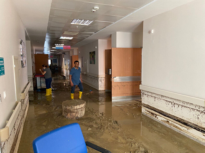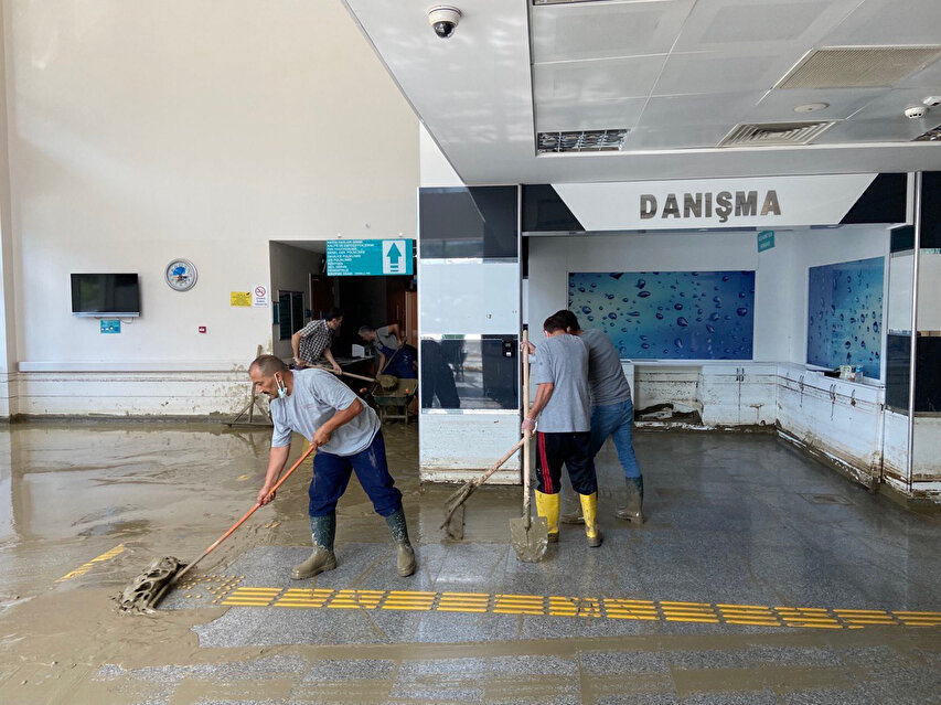 Sel felaketinin ikinci gününde hastanede inceleme yapan Ulaştırma ve Altyapı Bakanı Adil Karaismailoğlu'nun talimatıyla hastanenin yeniden hizmet vermeye hazır hale getirilmesi için yoğun bir çalışma yürütülüyor.