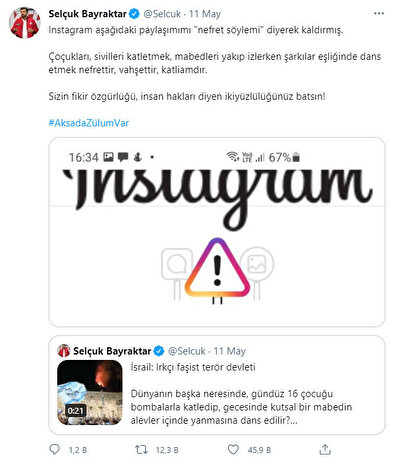 Instagram, Mescid-i Aksa'da çıkan yangın sırasında sevinen işgalci Yahudilerin görüntülerini paylaşan Baykar Teknik Müdürü Selçuk Bayraktar'a sansür uygulamış, "nefret söylemi" diyerek paylaşımını kaldırmıştı.