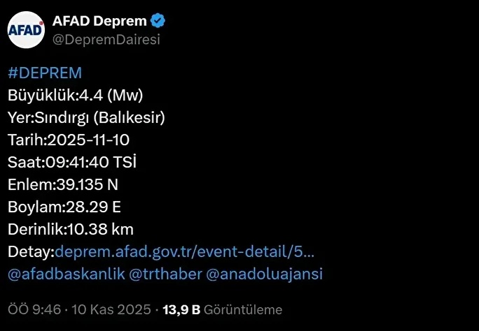 Afet ve Acil Durum Yönetimi Başkanlığı (AFAD), Balıkesir’in Sındırgı ilçesinde sabah saatlerinde 4.4 büyüklüğünde bir depremin meydana geldiğini açıkladı. Deprem, saat 09.41’de kaydedildi.