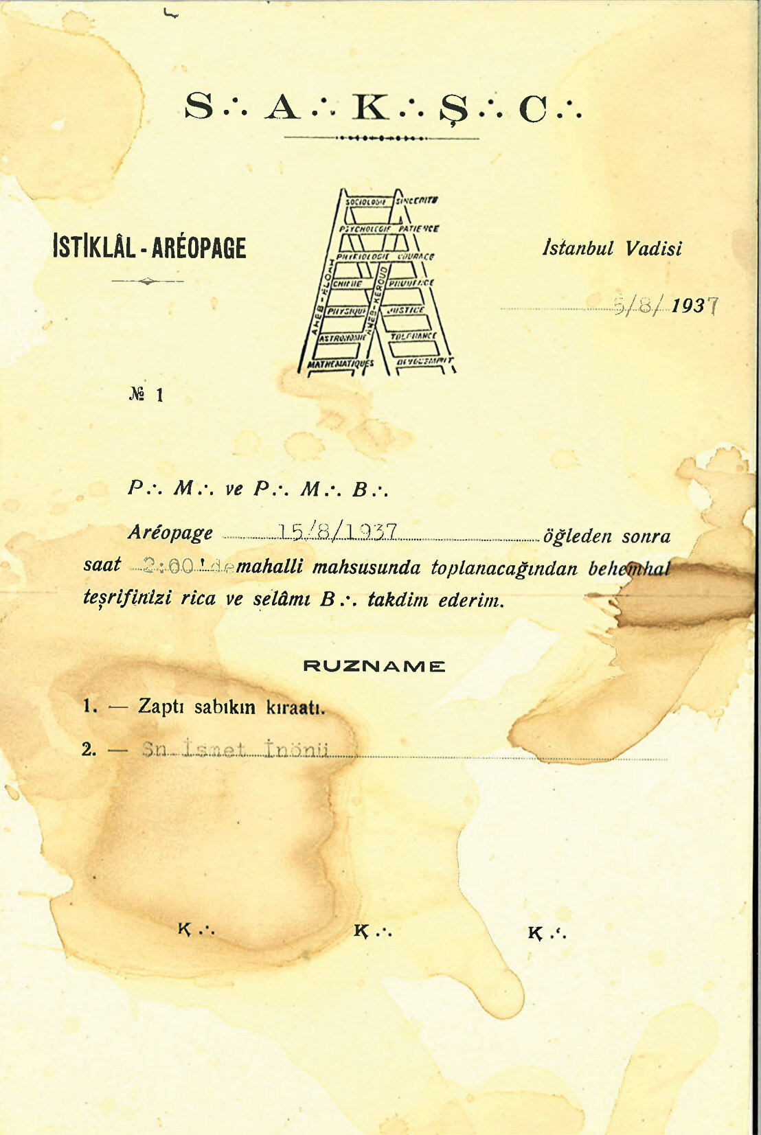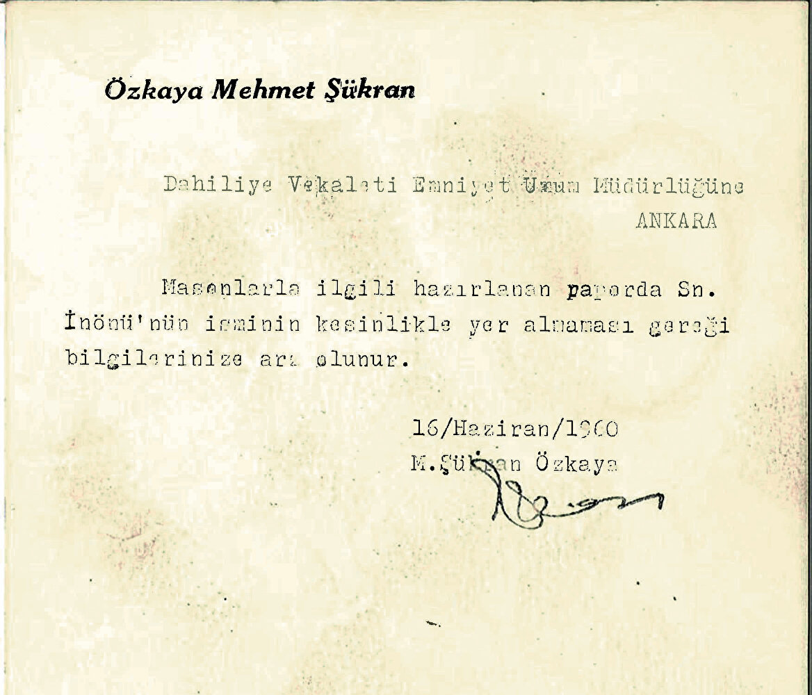 “Masonlarla ilgili hazırlanan raporda Sn. İnönü’nün isminin kesinlikle yer almaması gereği bilgilerinize arz olunur…”