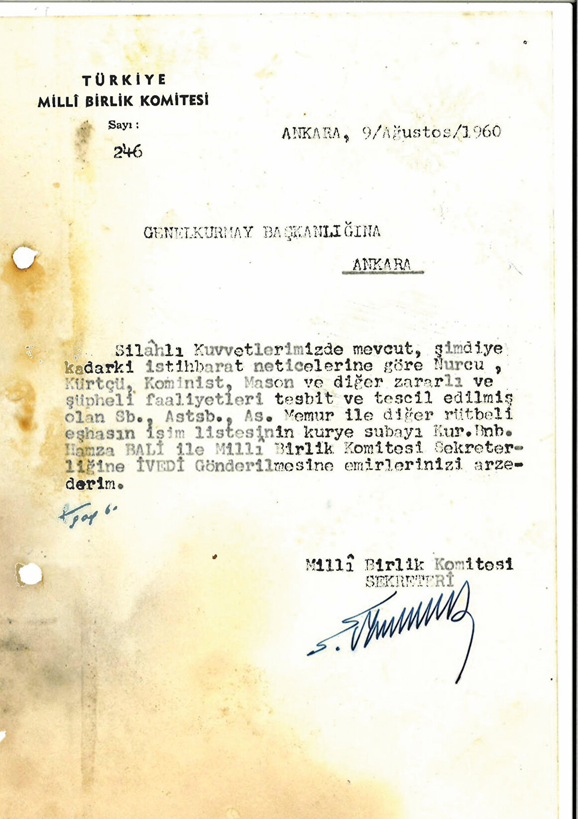 ’in arşivinde yer alan masonlukla ilgili şok belgelere ulaştı. Derginin bu haftaki sayısında yer alan bilgilere göre 27 Mayıs darbesinden sonra yönetimi eline alan Millî Birlik Komitesi, dönemin İçişleri Bakanlığı’na bağlı, Emniyet Umum Müdürlüğü ile daha sonra adı Milli İstihbarat Teşkilatı olarak değiştirilecek Millî Amele Hizmet Teşkilatı’na (MAH) 2 ayrı yazı yazarak Türkiye’deki masonluk faaliyetleri ve masonlar hakkında bilgi talep etti.