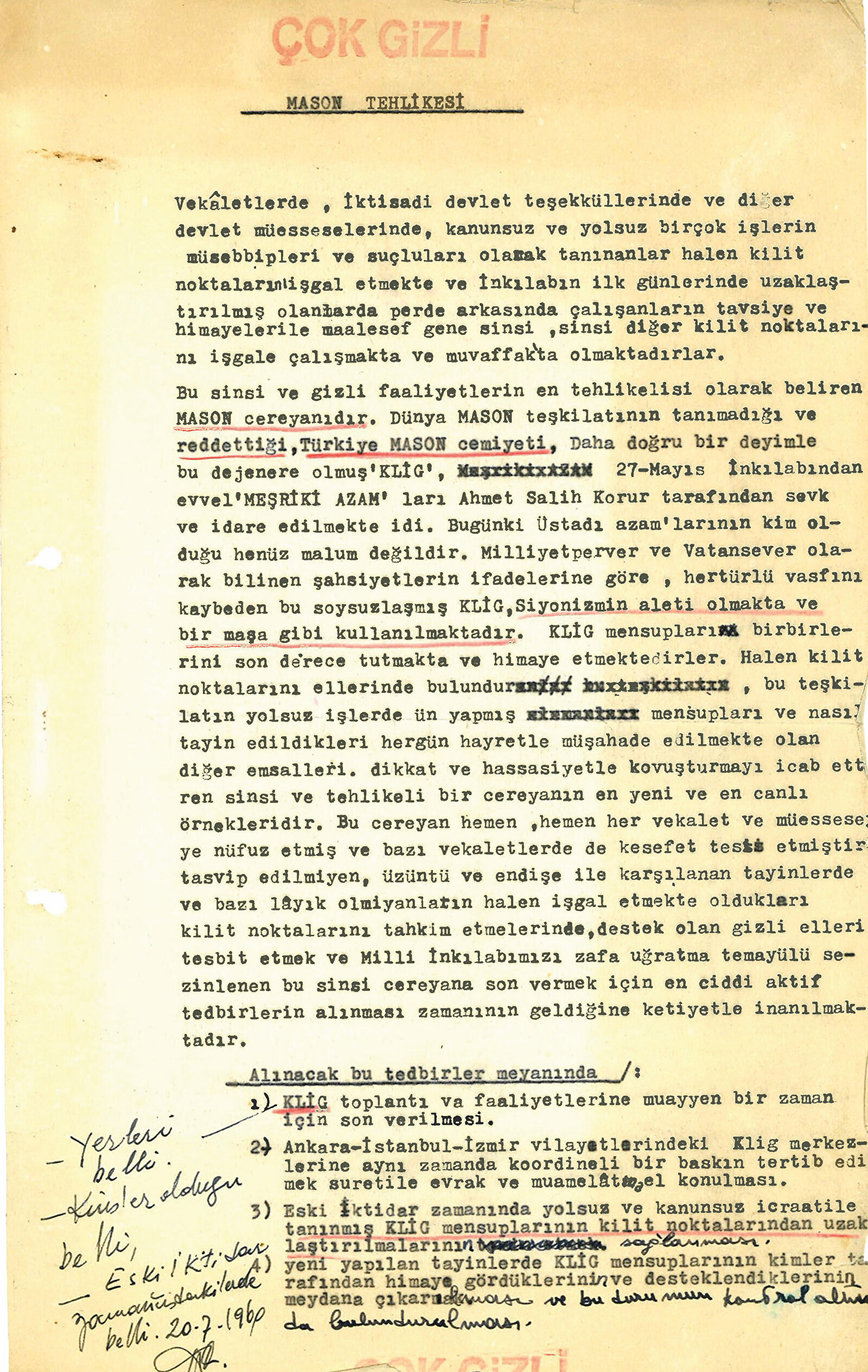 Müsteşar Hilmi İncesulu imzalı raporda masonlar ve FETÖ gibi masonik örgütlerin bugün olduğu gibi geçmişte te devleti ele geçirmeye çalıştığını ortaya koydu. Raporda şu ifadelere yer verildi. “Vekâletlerde (Bakanlıklarda), İktisadi Devlet Teşekkülleri (KİT)’nde ve diğer devlet müesseselerinde, kanunsuz ve yolsuz birçok işlerin müsebbipleri ve suçluları olarak tanınanlar halen kilit noktalarını işgal etmekte ve İnkılabın ilk günlerinde uzaklaştırılmış olanlarda perde arkasında çalışanların tavsiye ve himayeler ile maalesef gene sinsi sinsi diğer kilit noktalarını işgale çalışmakta ve muvaffak olmaktadırlar.”