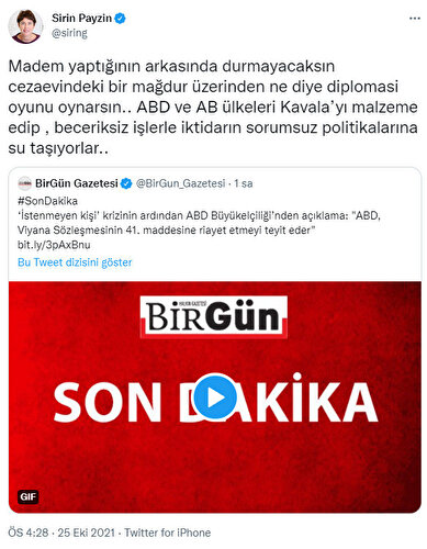 Halk TV sunucusu Şirin Payzın, Türk yargısını hedef alan ortak açıklama yapan büyükelçilerin geri adım atmasına tepki gösterdi. Elçileri yaptıkları açıklamanın arkasında durmamakla suçladı. Payzın, "Madem yaptığının arkasında durmayacaksın, ne diye diplomasi oyunu oynarsın?" diyerek, hükümeti haklı çıkardığını savundu.