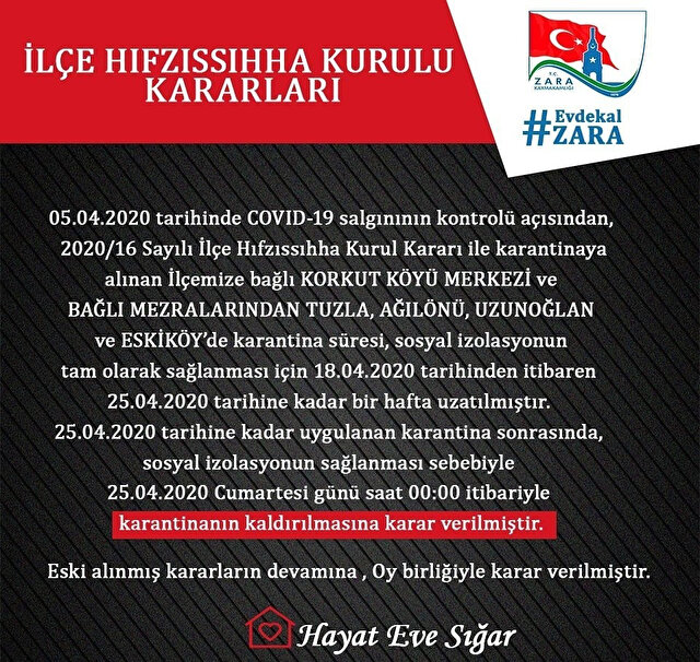 Konuyla ilgili Zara Kaymakamlığından yapılan açıklamada, “05.04.2019 tarihinde Covid-19 salgınının, kontrolü açısından 2020/16 sayılı İlçe Hıfzıssıhha Kurul kararı ile karantina alınan ilçemize bağlı Korkut köyü merkezi ve bağlı mezralardan Tuzla, Ağılönü, Eskiköy ve Uzunoğlan’da karantina süresi, sosyal izolasyonun tam olarak sağlanması için 18.04.2020 tarihinden itibaren 25.04.2020 tarihine kadar bir hafta uzatılmıştır. 25.04.2020 tarihine kadar uygulanan karantina sonrasında, sosyal izolasyonun sağlanması sebebiyle 25.04.2020 Cumartesi 00.00 itibariyle karantinanın kaldırılmasına karar verilmiştir“ ifadelerine yer verildi.