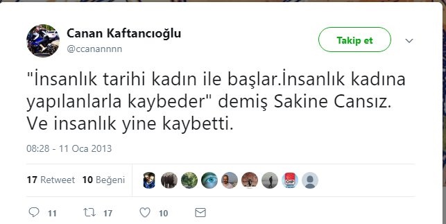 CHP İstanbul İl Başkanı Canan Kaftancıoğlu’nun birkaç gündür tartışılan skandal tweetlerinin ardı arkası kesilmiyor. Kaftancıoğlu'nun son olarak, PKK'lı terörist Sakine Cansız'ın 2013 yılında öldürülmesinin ardından yaptığı paylaşım gündeme oturdu.