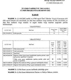 Solunum cihazlarının ihraçlarının ön izne bağlı mallar listesine eklenmesine ilişkin Cumhurbaşkanı Kararı Resmi Gazete'de yayımlandı. Yine yayımlanan başka bir karar ile tütün yerine geçen maddelerden yapılmış sigaraların yüzde 40 olan ÖTV tutarı yüzde 80'e, kolalı gazozlarda yüzde 25 olan ÖTV tutarı tutarı ise yapılan değişiklikle yüzde 35'e yükseltildi.