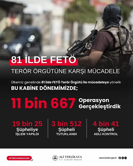 Bakan Yerlikaya, NSosyal hesabından yaptığı açıklamada, FETÖ’ye karşı mücadeleyi kararlılıkla sürdürdüklerini belirterek, "Son 1 hafta içinde FETÖ’ye yönelik 39 operasyon düzenledik. 97 şüpheli yakalandı ve işlem yapıldı. 16’sı tutuklandı, 27’si hakkında adli kontrol hükümleri uygulandı. Bu kabine dönemimizde FETÖ’ye yönelik 11 bin 667 operasyon gerçekleştirdik. Bu operasyonlarımızda toplam; 19 bin 25 şüpheli yakalandı ve işlem yapıldı. 3 bin 512’si tutuklandı. 4 bin 41’i hakkında adli kontrol hükümleri uygulandı. Operasyonları gerçekleştiren polisimizi ve jandarmamızı tebrik ediyorum. Allah ayaklarına taş değdirmesin. Milletimizin birlik ve beraberliğine, devletimizin bütünlüğüne, vatandaşlarımızın huzuruna ve refahına kastedenlere karşı mücadelemize kararlılıkla devam ediyoruz. Su uyur FETÖVARİ örgütler uyumaz" dedi.