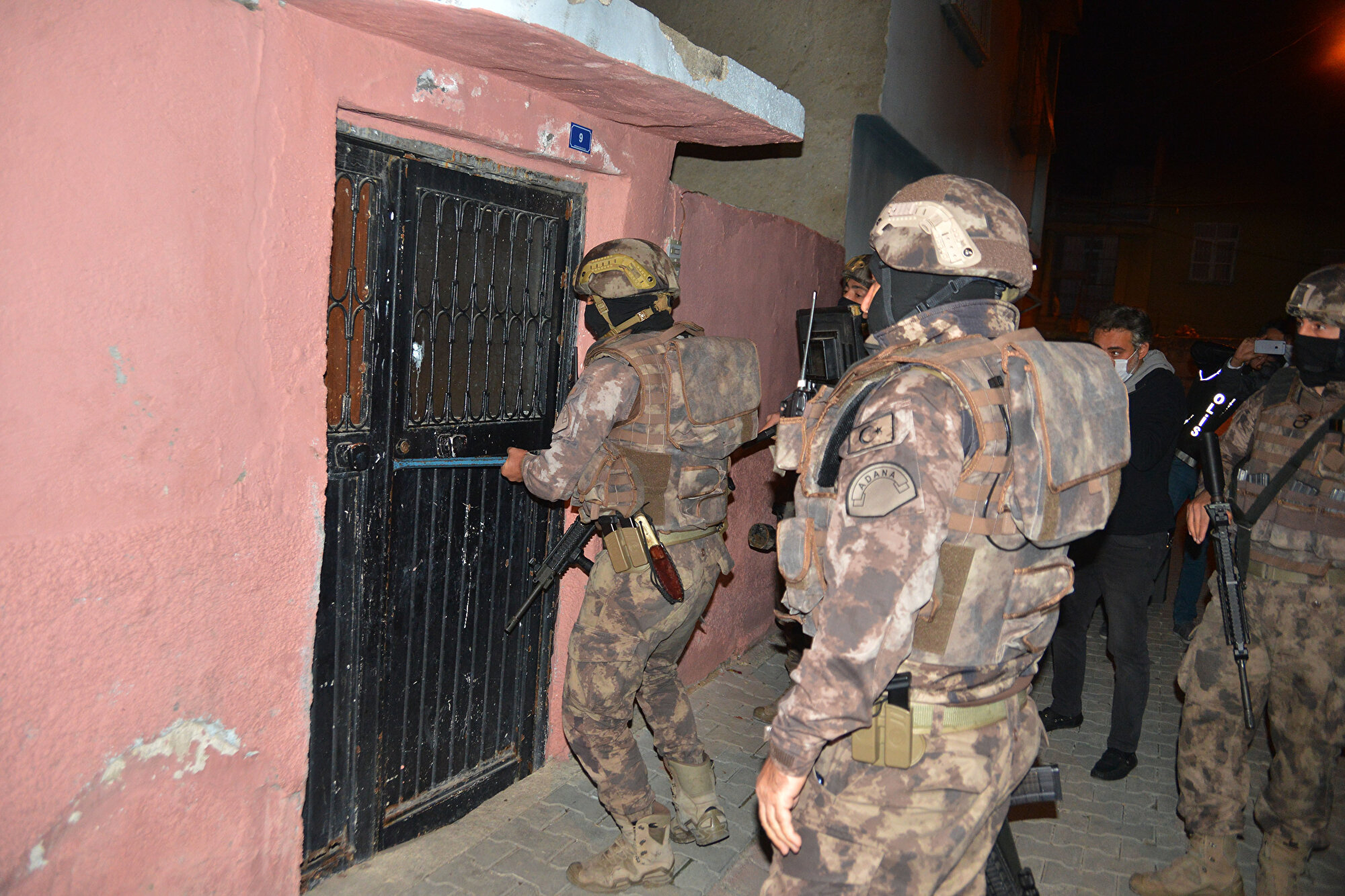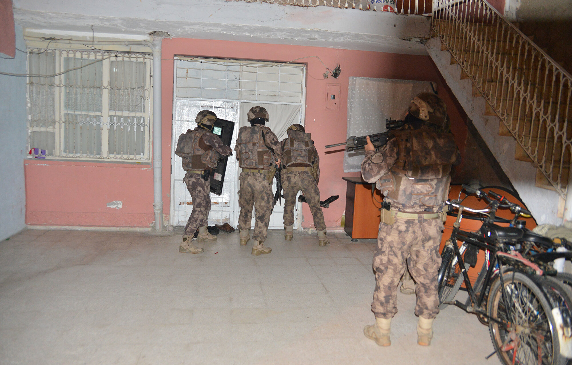 Özel Harekat Polisleri'nin demir kapıları koçbaşlarıyla kırarak girdiği evlerde, çok sayıda şüpheli gözaltına alındı. Sağlık kontrolünden geçirilen şüpheliler, sorgulanmak üzere emniyete götürüldü.