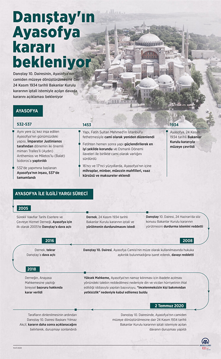 Danıştayın Ayasofya kararı için beklenen gün geldi. Herkes Danıştay'ın Ayasofya kararını merakla bekliyordu. Danıştay 10. Dairesi, Ayasofya'nın camiden müzeye dönüştürülmesine dair 24 Kasım 1934 tarihli Bakanlar Kurulu kararını iptal etti. Danıştayın gerekçesinde, Ayasofya'nın Fatih Sultan Mehmet Han Vakfı mülkiyetinde olduğu, cami olarak toplumun hizmetine sunulduğu belirtildi. Ayrıca gerekçede, Ayasofya'nın tapu belgesinde cami vasfı ile tescilli olduğu, bunun değiştirilemeyeceği kaydedildi.