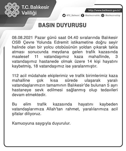 Balıkesir’de yolcu otobüsü yoldan çıkarak takla attı. Kaza sonucu 11 kişi kaza yerinde, 4 kişi hastanede olmak üzere 15 kişi hayatını kaybetti, 17 kişi yaralandı. Yaralılar kaza yerine ulaşan ekipler tarafından bölgedeki 5 hastaneye götürülerek tedaviye alındı.