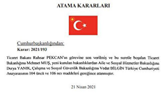 Karara göre; Aile ve Sosyal Hizmetler Bakanlığı görevine Derya Yanık, Çalışma ve Sosyal Güvenlik Bakanlığına Vedat Bilgin, Ticaret Bakanlığına Mehmet Muş atandı.