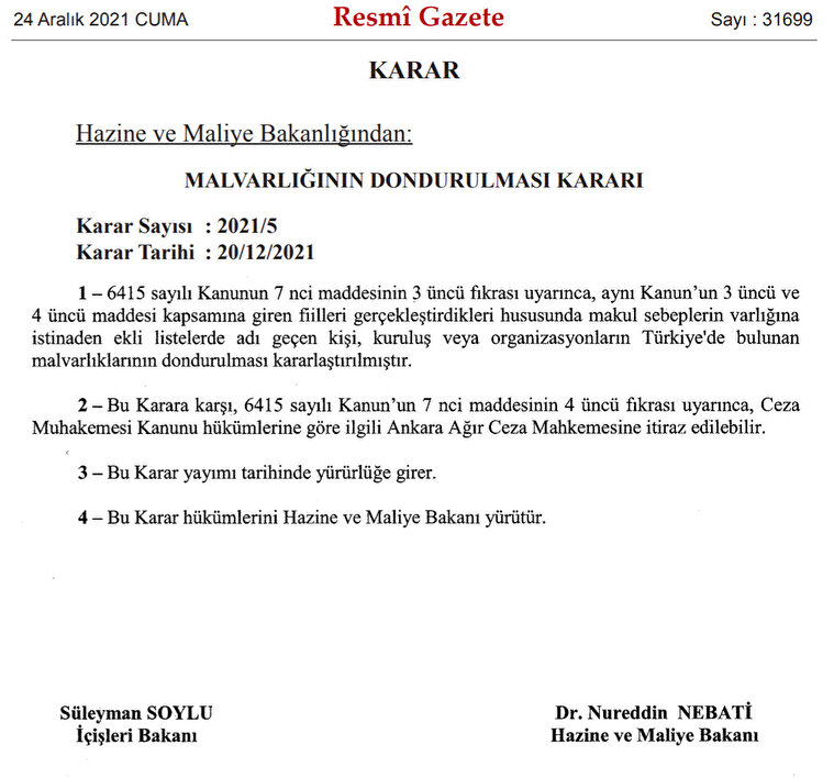Resmi Gazete'de yayımlanan kararla aralarında Zekeriya Öz, Tarık Toros ve Abdülkerim Balcı'nın da yer aldığı FETÖ/PDY terör örgütü üyesi 454, PKK/KCK terör örgütü üyesi 108, dini istismar eden terör örgütlerine üye 119, sol terör örgütlerine üye 89 kişinin mal varlıkları donduruldu.