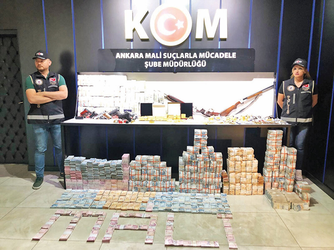 Operasyon kapsamında şüphelilerin ev ve iş yerlerinde yapılan aramalarda ise yaklaşık 4 kamyon dolusu belge, ziynet eşyaları ve 500 milyon lira ele geçirildi. Bu eşyalar ve paralar Emniyet’te sergilendi. Masa üzerine sığmayan balya balya dolar ve TL cinsi paralar, yere dizildi. Ayrıca çok sayıda ziynet eşyasının yanısıra altın kaplama cep telefonunun da sergilendiği görüldü.