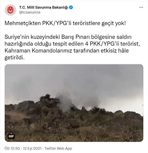 Bakanlığın Twitter hesabından yapılan açıklamada, "Mehmetçikten PKK/YPG'li teröristlere geçit yok! Suriye'nin kuzeyindeki Barış Pınarı bölgesine saldırı hazırlığında olduğu tespit edilen 4 PKK/YPG'li terörist, kahraman komandolarımız tarafından etkisiz hale getirildi" denildi.