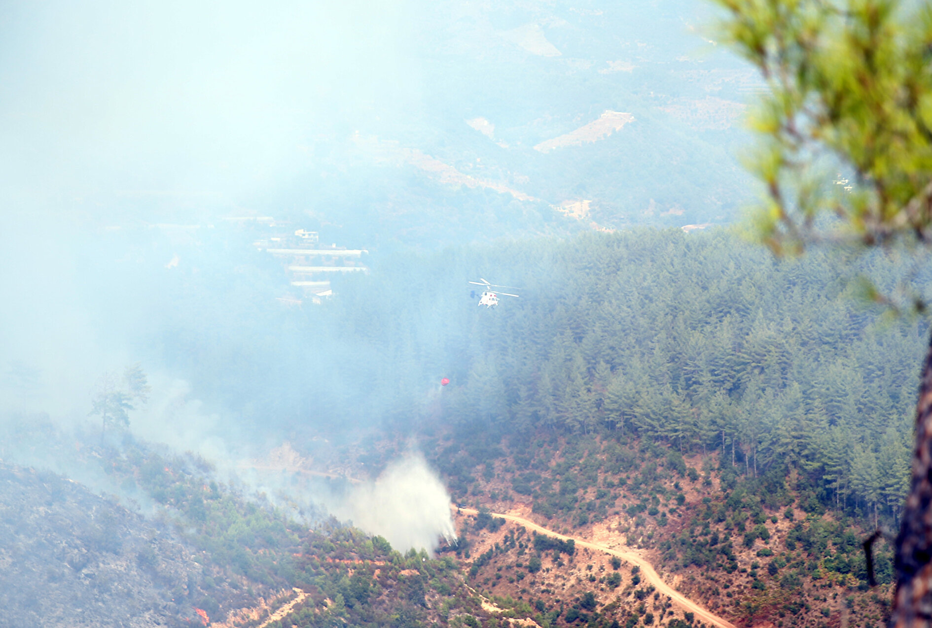 Alevler, Alanya ilçesine bağlı Bayır Mahallesi'ne sıçradı. Yangına, ekipler havadan ve karadan müdahale ediyor.