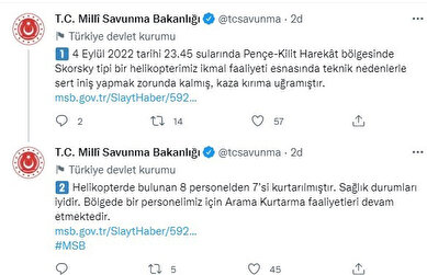 - "4 Eylül 2022 tarihi, 23.45 sularında Pençe-Kilit Harekât bölgesinde Skorsky tipi bir helikopterimiz ikmal faaliyeti esnasında teknik nedenlerle sert iniş yapmak zorunda kalmış, kaza kırıma uğramıştır. Helikopterde bulunan 8 personelden 7’si kurtarılmıştır. Sağlık durumları iyidir. Bölgede bir personelimiz için Arama Kurtarma faaliyetleri devam etmektedir. Kamuoyuna saygı ile duyurulur."