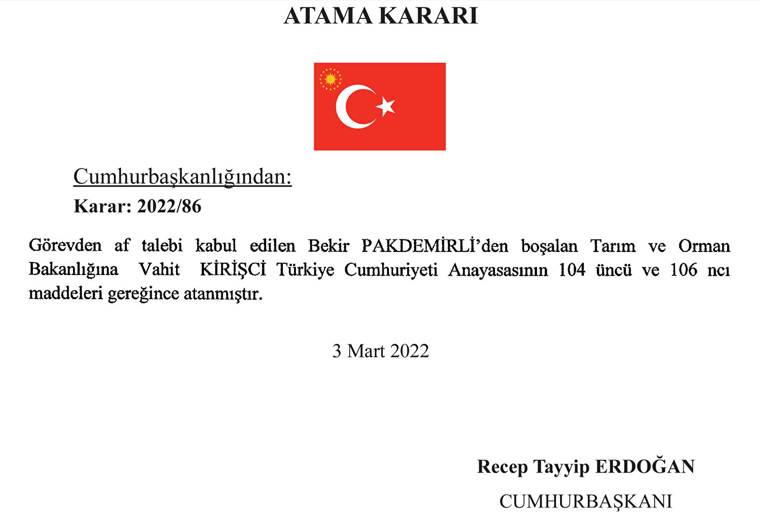 Resmi Gazete'de, Cumhurbaşkanı Recep Tayyip Erdoğan'ın imzasıyla yayımlanan atama kararına göre; Tarım ve Orman Bakanı Bekir Pakdemirli görevinden istifa etti. Pakdemirli'nin yerine Vahit Kirişçi atandı.