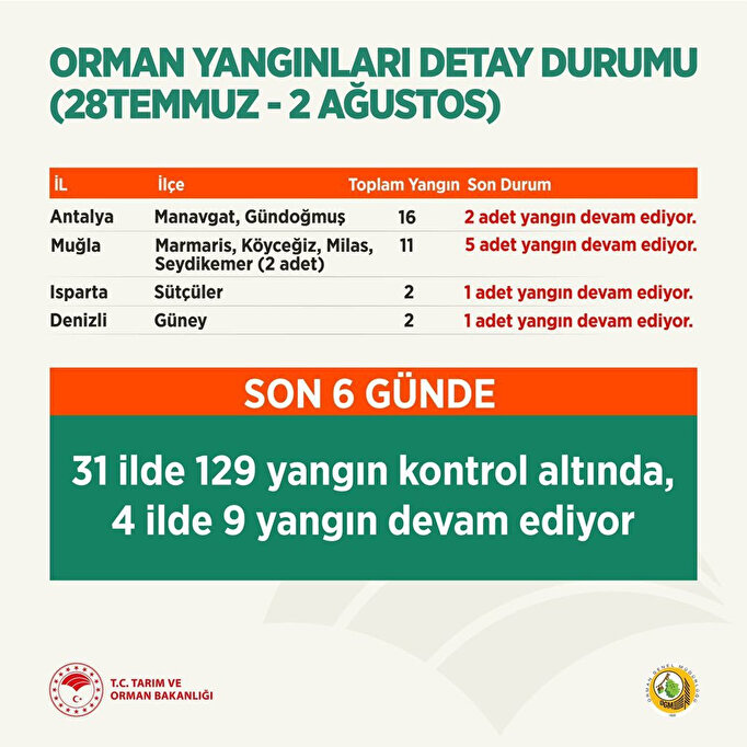 Bakan Pakdemirli'nin paylaşımında yer verdiği tabloda, Antalya'nın Manavgat ve Gündoğmuş ilçelerinde birer, Muğla'nın Marmaris, Köyceğiz ve Milas ilçelerinde bir, Seydikemer ilçesinde 2, Isparta'nın Sütçüler ilçesinde bir, Denizli'nin Güney ilçesinde bir olmak üzere 9 yangının devam ettiği bilgisi yer aldı.