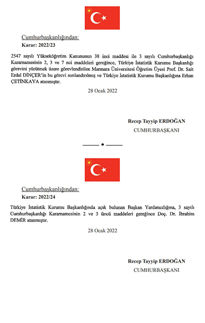Resmi Gazete'de Cumhurbaşkanlığı tarafından yapılan atama kararları yayımlandı. Türkiye İstatistik Kurumu Başkanlığı'na görev değişimiyle Erhan Çetinkaya atandı.