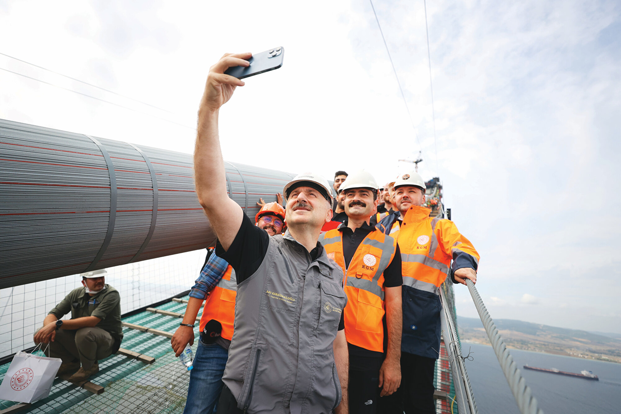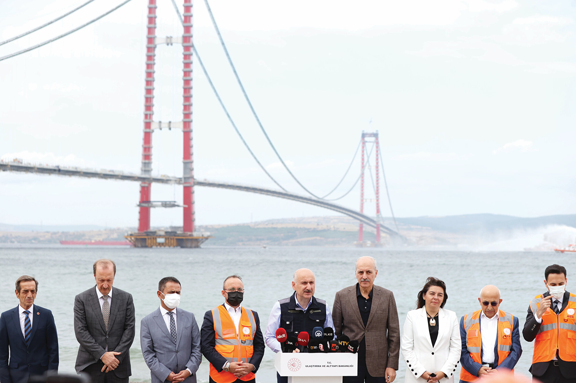 15 Temmuz Şehitler, Fatih ve Yavuz köprülerinin ardından Asya ile Avrupa kıtalarını karayoluyla dördüncü bir boğaz köprüsüyle birleştiren 1915 Çanakkale Köprüsü’nde 87 tabliyenin montajı tamamlandı. 18 Mart 2022’de hizmete açılması hedeflenen köprüyü kullanarak Asya’dan Avrupa’ya geçen Ulaştırma Bakanı Adil Karaismailoğlu, “Artık ‘Asırların hayali’ için geri sayım başladı diyebiliriz” dedi.